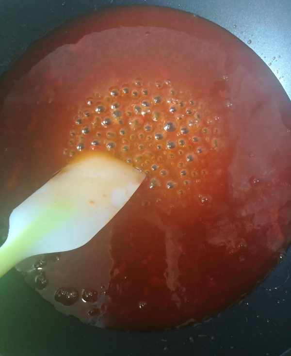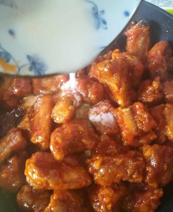 第五步:鍋裡加少許水後加入調好的碗汁熬粘稠下入炸好的排骨翻炒幾下再加入調好的水淀粉繼續翻炒排骨如圖