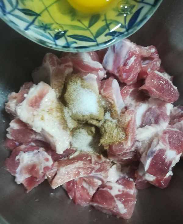 第二步:洗凈控幹水分的排骨加料酒,胡椒粉,幹淀粉,雞蛋,鹽抓均勻如圖
