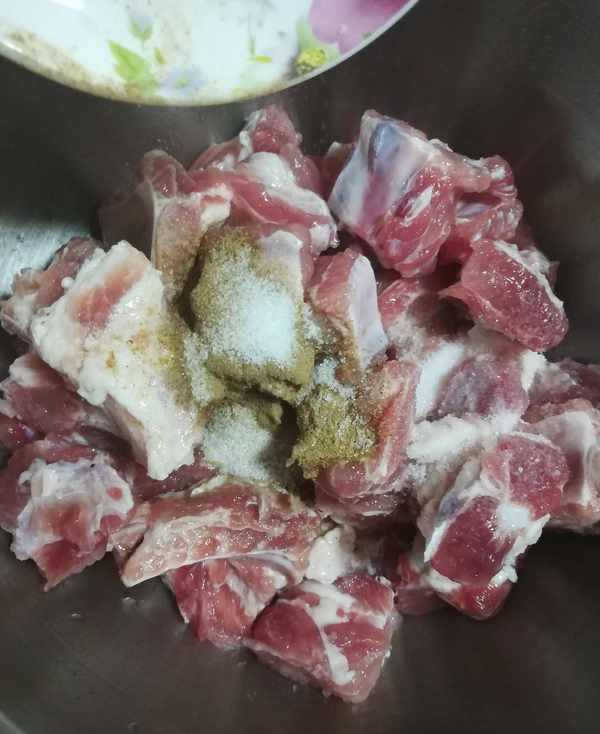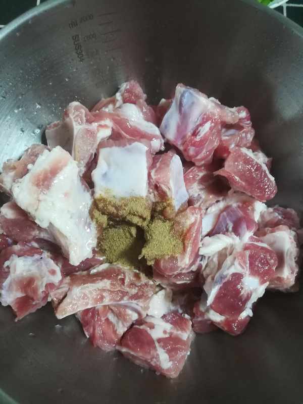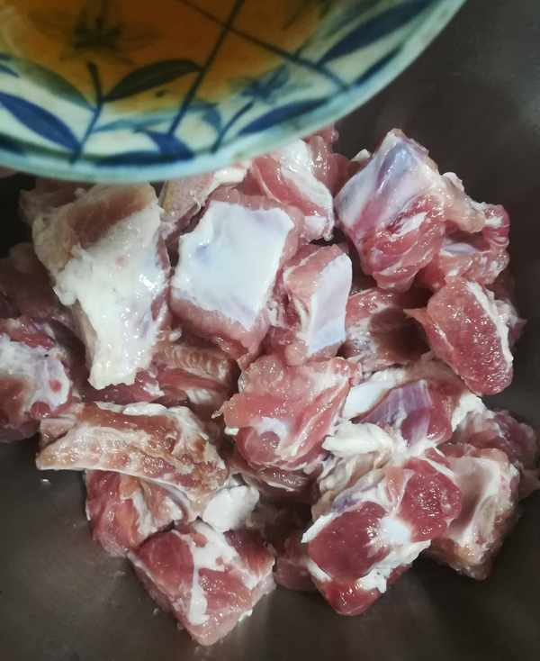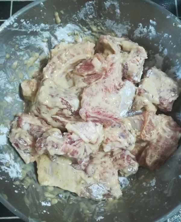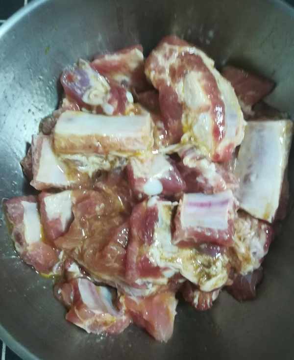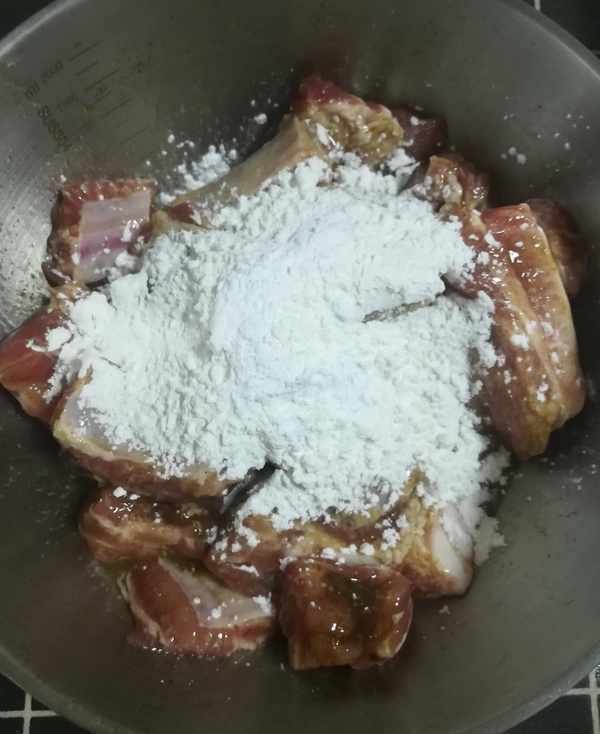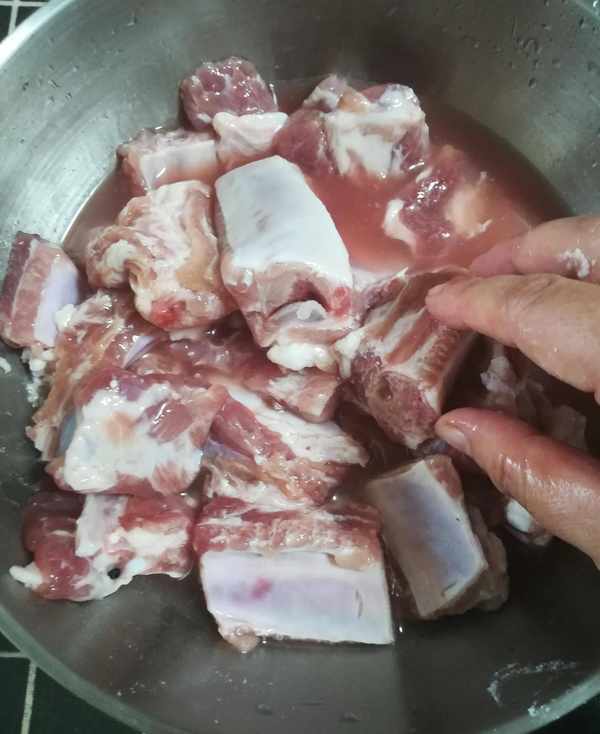 第一步:排骨加面堿和清水用手抓洗幹凈後 控幹水分如圖
