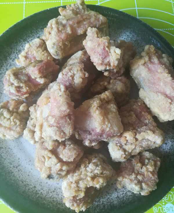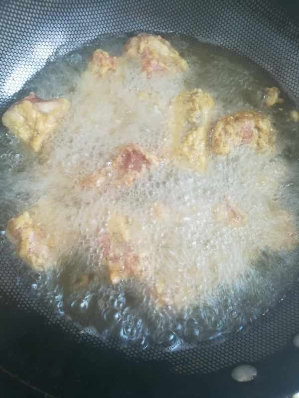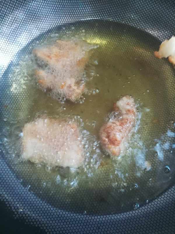 第三步:起鍋燒油,油燒 六成熱下鍋炸排骨定型後把油溫升至八層熱再下鍋炸排骨至金黃色如圖