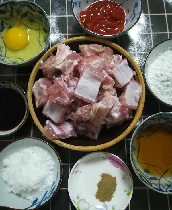 配料表:排骨500克,堿面適量,料酒適量,胡椒粉少許,玉米淀粉適量,雞蛋一個,白糖適量,米醋適量,水淀粉適量,番茄醬少許