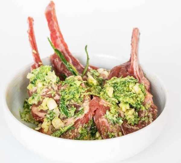 第2步、把羊排化凍,用叉子兩面戳洞(讓肉更容易入味),然後將迷迭香黃油蒜糊兩面抹勻,撒上適量黑胡椒,拌勻後醃制1~2小時。