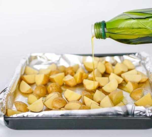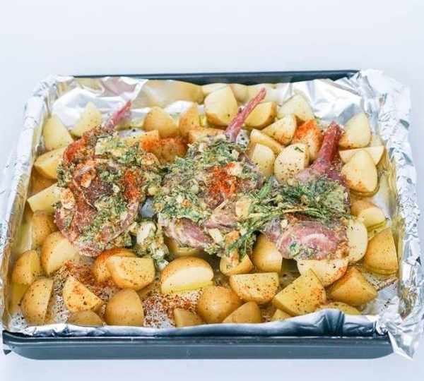 第3步、將小土豆用鹽搓洗幹凈,每個用十字刀切成4瓣,鋪在墊好錫紙的烤盤上,淋上少許橄欖油,撒鹽、黑胡椒、辣椒粉。然後將醃好的羊排蓋在土豆上