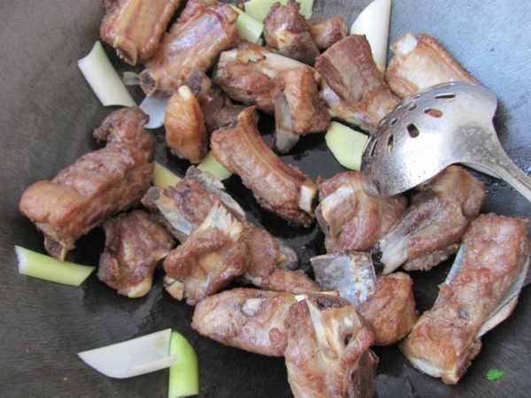 第五步:把炸好的羊排放到鍋裏,加入葱段炒香。