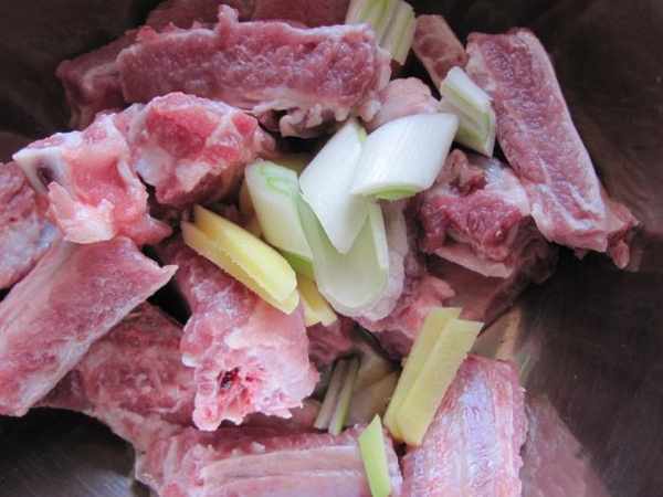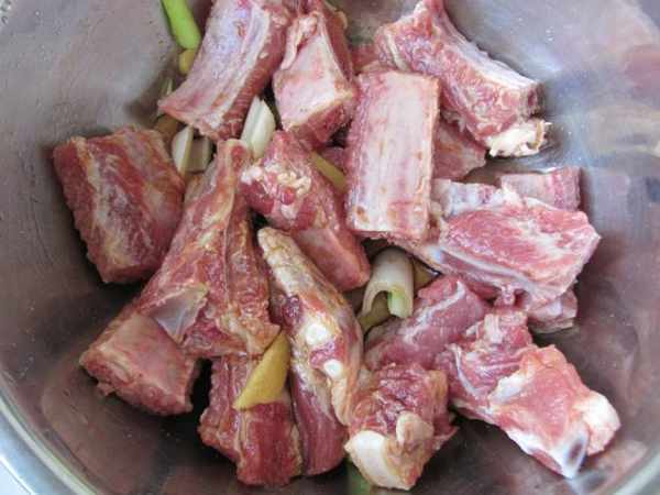 第一步:羊排骨剁成小塊,加入葱段,薑,鹽,料酒拌勻去腥。