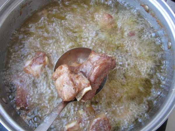 第四步:鍋裏加入花生油燒到5成熱,倒入醃漬好的羊排中小火炸制到金黃色撈出。