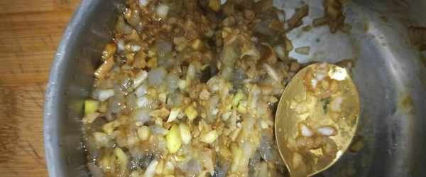 1,先把幾個鮮蝦摘洗幹凈,加入蔥、薑一起剁成泥。