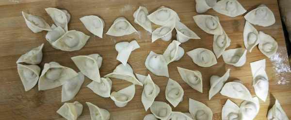 3,和瞭一小塊面(這裡沒有賣成品餛飩皮的,再說是臨時想做),放入盆中蓋蓋醒幾分鐘,然後擱面板上揉一揉,搟成一個圓形的面皮(就像搟面條一樣,比搟面條的面稍軟一點)。然後切成餛飩皮即可。具體細節不多說瞭。