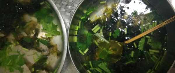 5,鍋中燒水,順便準備湯料:適量香菜切成小段,碗中加入適量紫菜、鹽、香油、切好的香菜和雞精,加入適量的開水就好瞭。