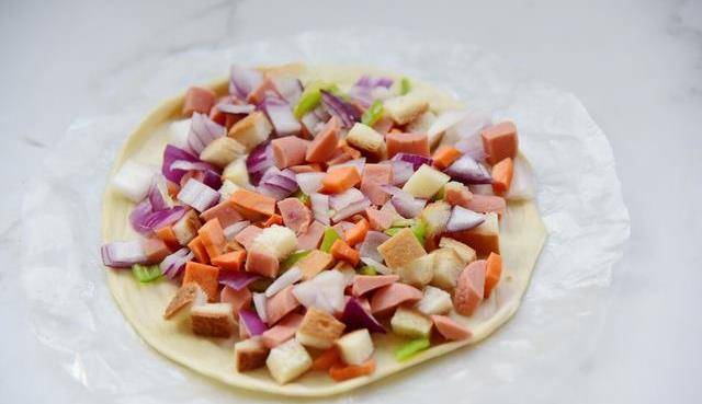 手抓餅1張,吐司2片,火腿30g,洋蔥20g,馬蘇裡拉芝士30g,青椒20g,胡蘿卜20g,鹽少許,黑胡椒粉少許