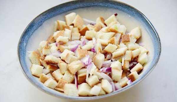1、把吐司切成大小均勻的小塊;火腿、洋蔥、青椒、胡蘿卜也分別切丁,並混合在一起,加入鹽、黑胡椒粉調味成為餡料備用。