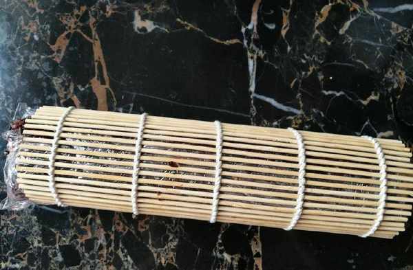 在卷簾上首先鋪上保鮮膜,然後將蒸好的紫米鋪好,要稍微用勺子壓實下