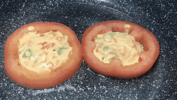 6.平底鍋放入適量的油,放入番茄圈,填入調好的糊狀調料。