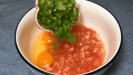 3.番茄肉切丁放入碗中,打入二個雞蛋,青椒丁。