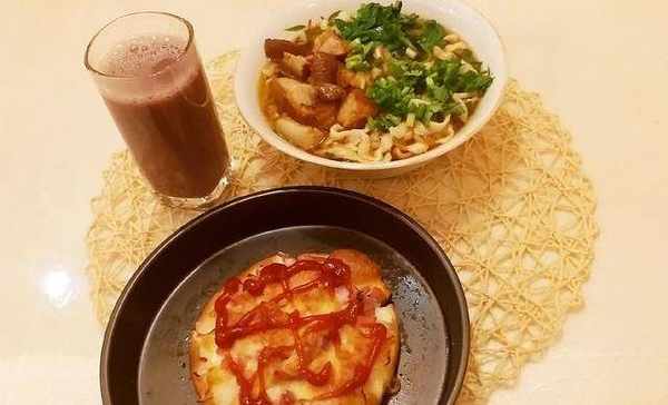 一碗豬腳面、一個小披薩、一杯營養露就把來送年貨的客人接待瞭,還吃得心滿意足,一直說自己有口福,碰上我們吃這樣的美味。