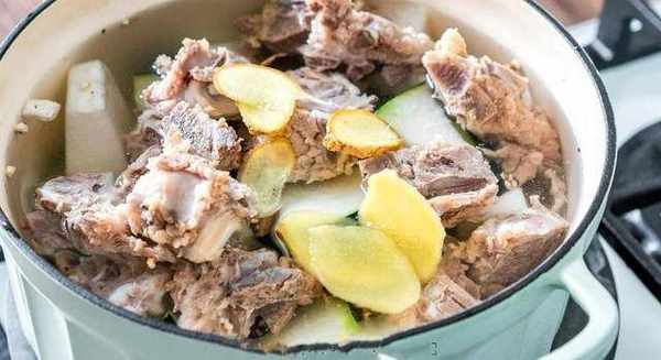 放入焯水後的豬骨頭,加滿水再放入薑片。