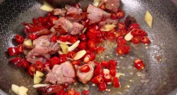 4、鴨肉炒香後下入蒜片、薑片、紅椒圈翻炒均勻,再加少量的水,炒出辣椒汁,直到蒜片炒熟辣椒出汁。