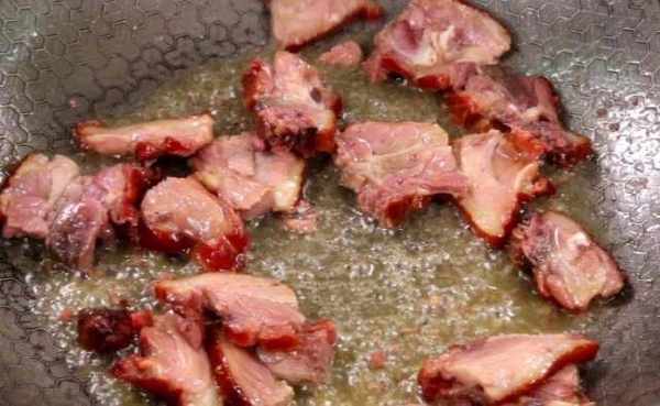3、把鍋熱油,把切好的臘鴨塊(3兩6)下入鍋中,中火煸炒一會,再多次加少量的水,炒出臘鴨腿中的鹽份,直到鹽分炒出,鴨腿炒香。