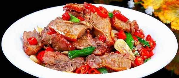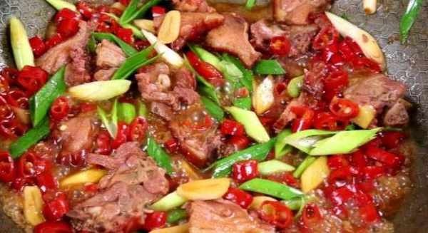 【紅椒臘鴨腿】材料:臘鴨腿、小紅椒、蒜片、薑片、大蒜苗、二鍋頭酒、老抽、雞精。