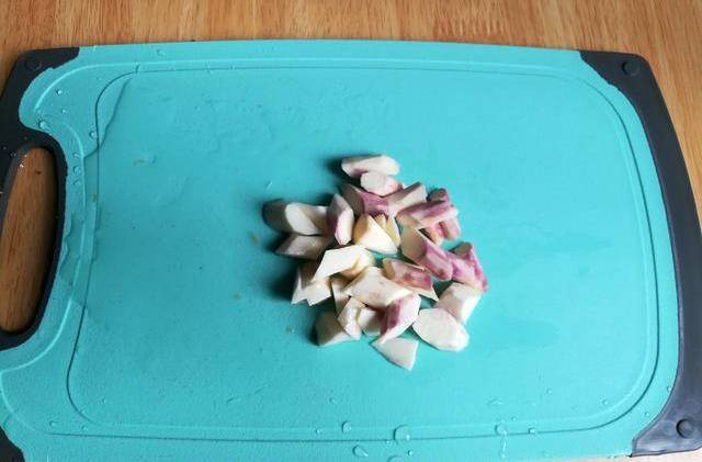 第四步:山藥洗凈削皮切成小丁,山藥裡有一種黏液,皮膚接觸後會引發手部發癢,建議戴一次性手套操作,或者是用塑料隔一下。