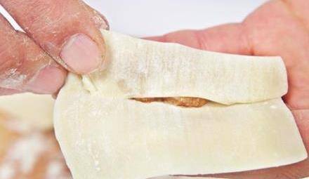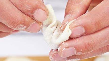 3取一片餛飩皮,在上面放少許餡,向上卷起,卷兩次,然後雙手大拇指及食指按住同側的兩邊,用力捏緊。最後將兩角重疊按壓,一個頗有棱角的餛飩就包好瞭。用此法逐一將餛飩包好備用。