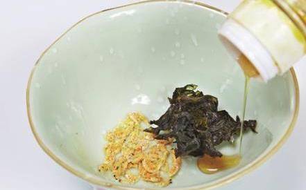 5取一個碗,放入香油、蝦皮、紫菜、香菜,然後連湯帶煮好的餛飩一起倒入碗中即可。一定要先放紫菜,後倒入餛飩,這樣味道更鮮。
