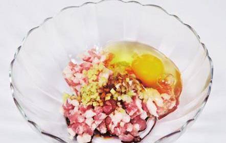 1在肉餡中放入生抽、雞蛋液、鹽、蔥花、薑末,順著一個方向攪拌,直至肉餡上勁。