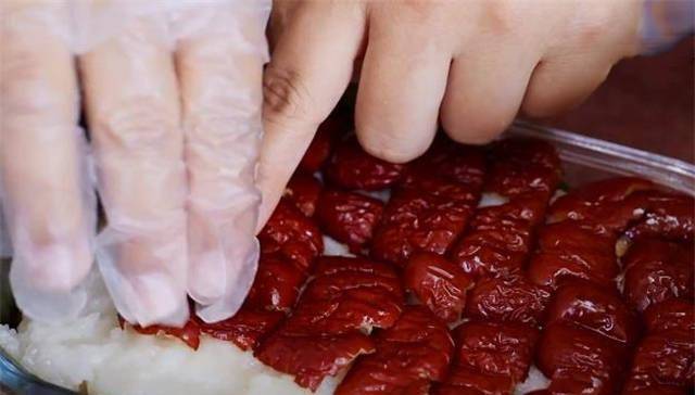 4.準備一個容器出來,裡面鋪上粽葉防粘,底部的位置先鋪一層糯米,上面再鋪一層紅棗,剩下的部分再按照一層糯米一層餡的方式鋪平。