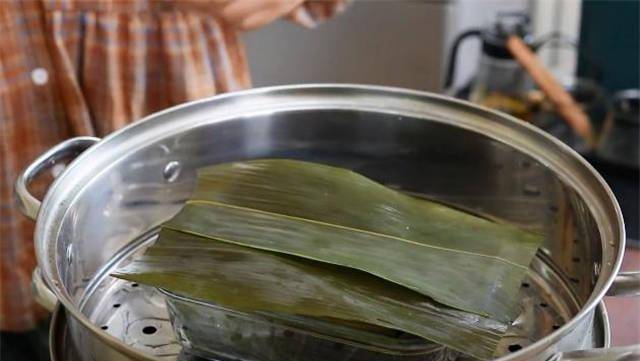 5.都整理好之後,兩邊的粽葉往裡折,再拿一些新的粽葉覆蓋住表面,這樣粽香味會更濃一些,水開之後再蒸半個小時。