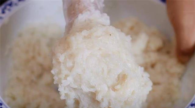 3.一根搟面杖套上一個保鮮袋纏繞起來,然後不停的去捶打這個糯米飯,如果覺得搗的時候偏幹,可以加一點清水進去,最後一直搗成這種發黏又抱團的程度。