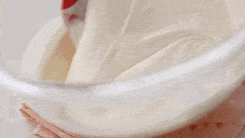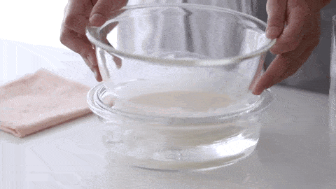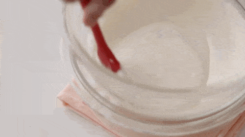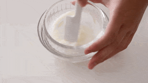 30g牛奶與5g吉利丁粉混合均勻,至於熱水上隔水攪拌融化,融化就好瞭不要停留太久。