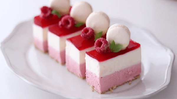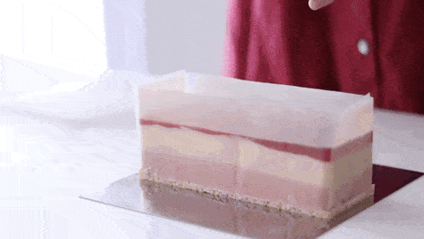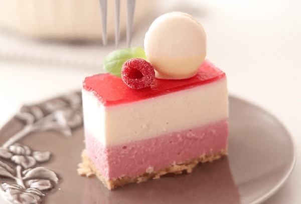 鮮紅色的鏡面果凍,粉紫色的樹莓慕斯以及白色的乳酪慕斯,此搭配給人一種明媚之感,亮麗的造型為它吸引不少人。