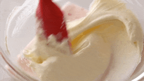 將白巧奶油倒入奶油奶酪中,像這樣用翻卷的手法將其拌均勻。
