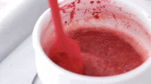 取出樹莓糖漿水,加入2g吉利丁粉攪拌均勻,然後放在熱水上隔水加熱攪拌融化。
