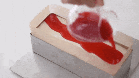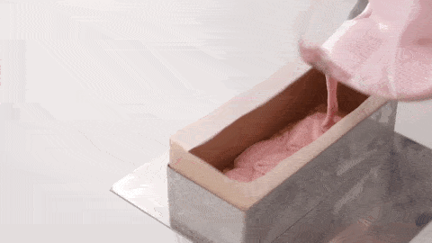 將混合好的樹莓奶酪倒入模具中,可以抹平,也可以搖晃震動平整。送入冰箱冷凍30分鐘。