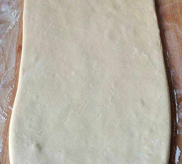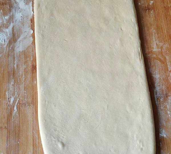第2步、早些取出冷藏的面團(如果當天制作無須冷藏),散發涼氣至室內溫度時(無需再揉制)、將面團搟成長方型面皮。
