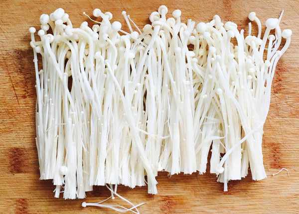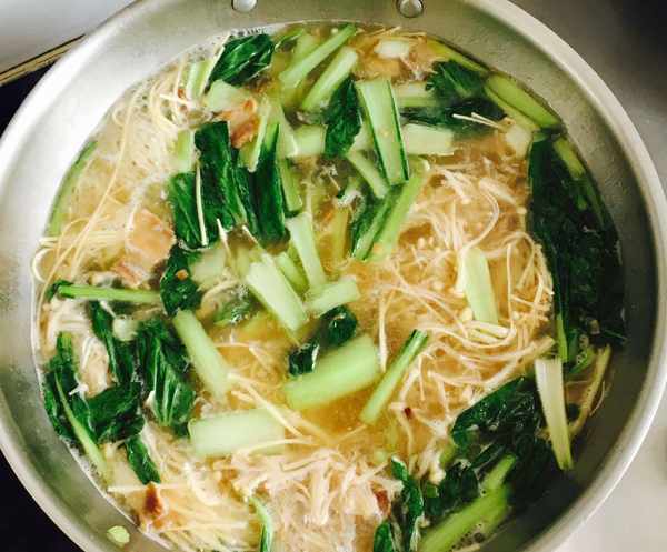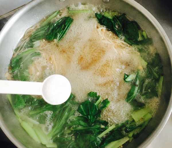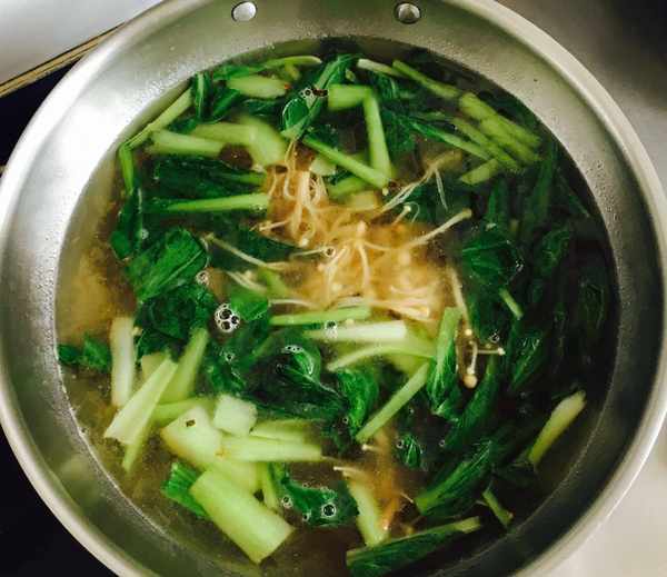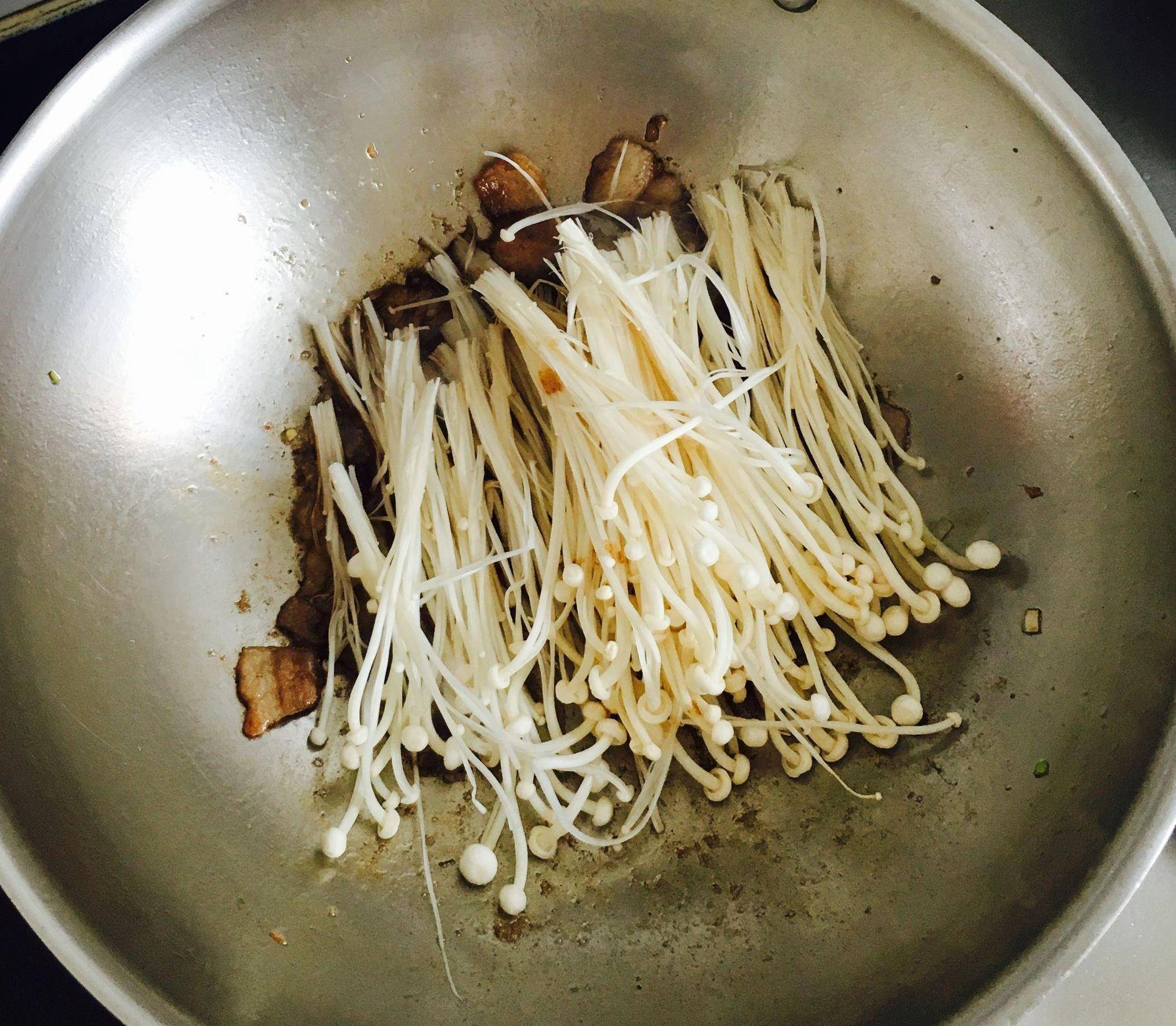 先放入金針菇翻炒一下,再放入青菜段翻炒均勻,加入適量的清水煮沸