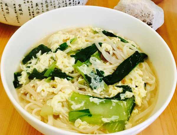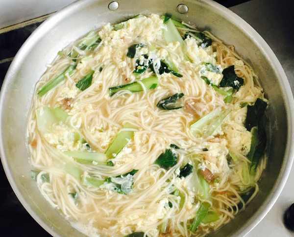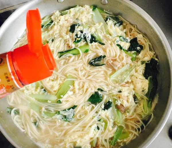 煮至面條快熟的時候,均勻的淋入雞蛋液輕輕攪散,關火後點幾滴香油加少許雞精調味,輕輕攪拌均勻即可