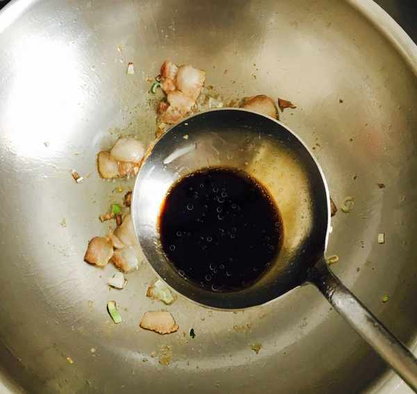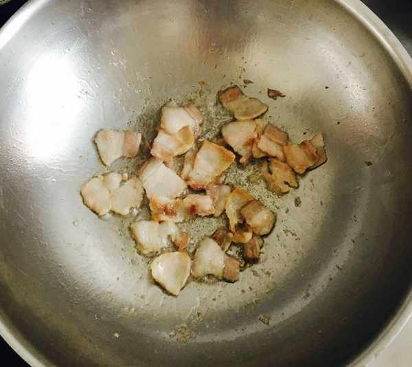 熱鍋加入花生油把五花肉片煸香出油,料酒、生抽烹鍋