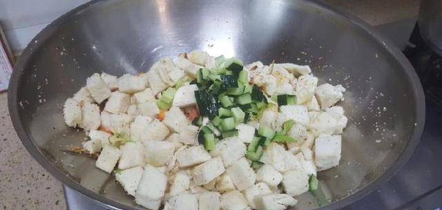 第三步:翻炒至饃塊稍稍變的外面一層焦脆的時候,就可以倒入黃瓜瞭,