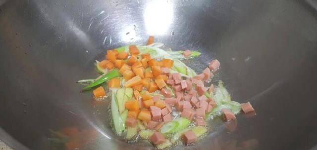 第二步:鍋中放少許的食用油,我這個油量並不大,主要這個鍋的視覺造成的。每次都有人問我這個問題,油放太多,先下入蔥花,蒜片,薑片爆香以後,下入紅蘿卜和火腿腸翻炒兩下,就可以倒入我們切好的饅頭塊瞭。