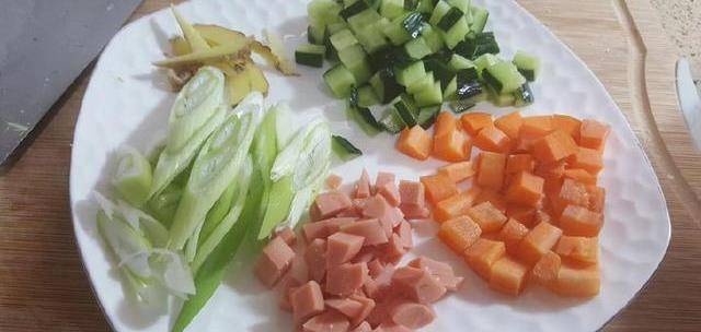 【制作食材】剩饅頭、雞蛋、黃瓜、蔥、紅蘿卜、火腿腸。光看這配菜,就已經非常漂亮,各個顏色的食材都有瞭,而且肉蛋相結合,也能補充孩子一天的基本營養瞭。