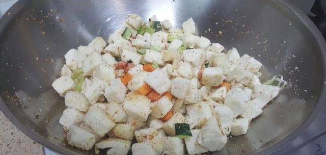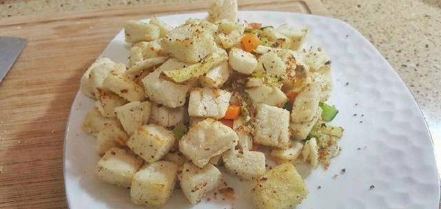 第四步:調料放食用鹽,十三香粉,孜然粉,黑胡椒粉,所有的調料都有撒的,以免扔一堆進去,饃塊不能充分沾到調料粉,出鍋前我還撒瞭點燒烤料,真是隨便做做都是香到爆炸瞭。老好吃瞭。