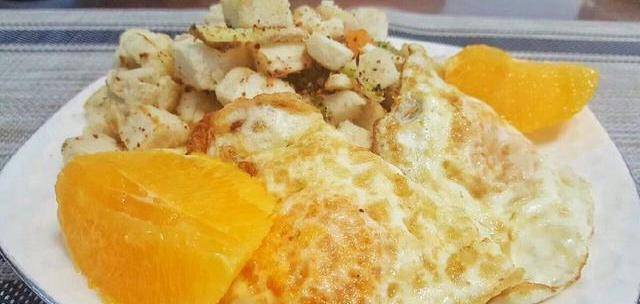 第五步:炒好的饃塊,再沖上兩碗麥片粥,我傢孩子特別喜歡吃煎的雞蛋,所以我沒有炒在饃塊裡,而是單獨用平底鍋煎雞蛋,煎好以後直接擺在饃塊上就可以瞭,兩個饅頭,一個橙子,兩個雞蛋,輕松解決瞭我和孩子的早餐問題,而且吃的好舒服。