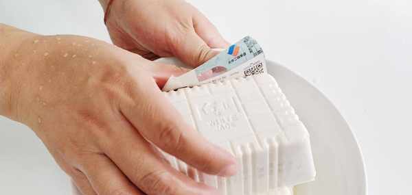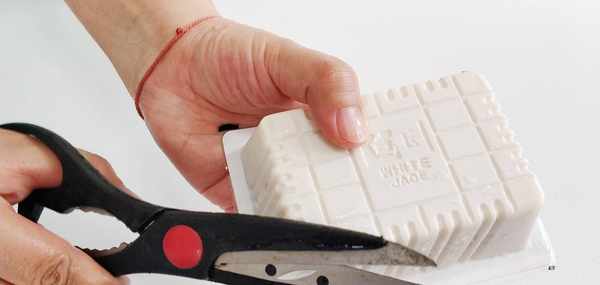 準備內脂豆腐,我用的是鮮豆腐,口感類似。用剪刀剪去盒子底端的四個角,用手輕拍盒底,再剪掉包裝的四周,將豆腐倒扣在盤中,這樣處理的豆腐更完整
