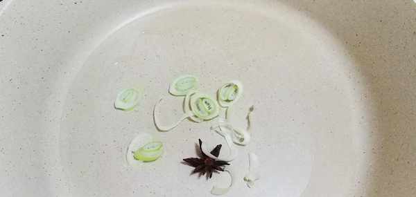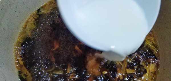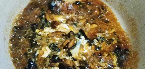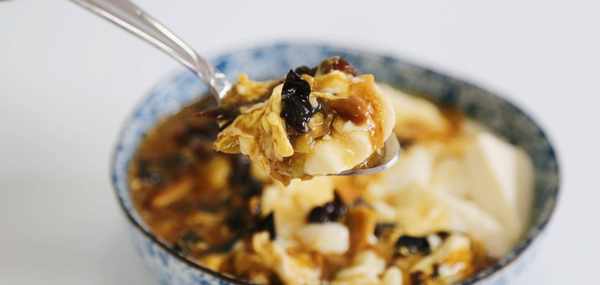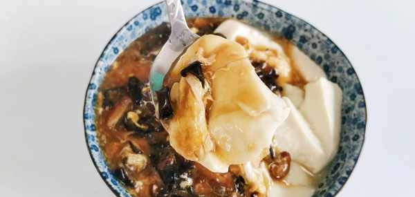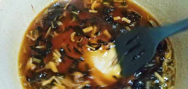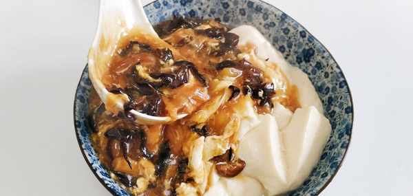 淋入打勻的雞蛋液,蛋花凝固浮起時用鏟子推動。出鍋前撒雞精,淋香油,豆腐腦的鹵汁就做好啦