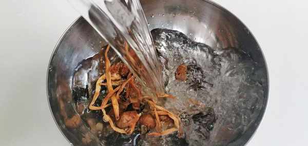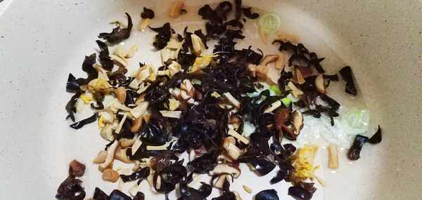 盆中放入幹香菇,木耳和黃花菜,用清水浸泡1小時,如果著急可以用80度左右的熱水泡十分鐘就可以