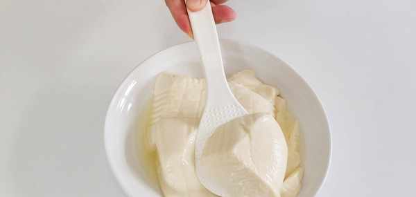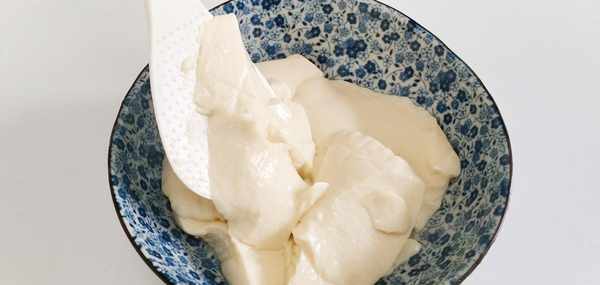 取出蒸好的豆腐,用平勺盛到碗中,碗中間的豆腐腦要凸起,也就是盛好後是中間高四周低