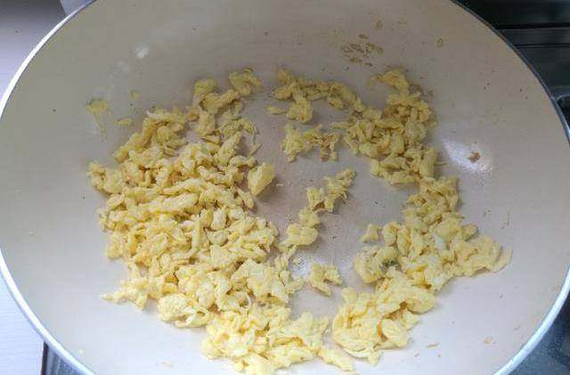 2、雞蛋磕入碗內,加入足夠的鹽(如果蝦皮是咸的,這裡要少放鹽),打散,坐鍋開火,鍋熱放油,雞蛋倒入鍋內,邊倒邊攪,攪成雞蛋碎,待用。