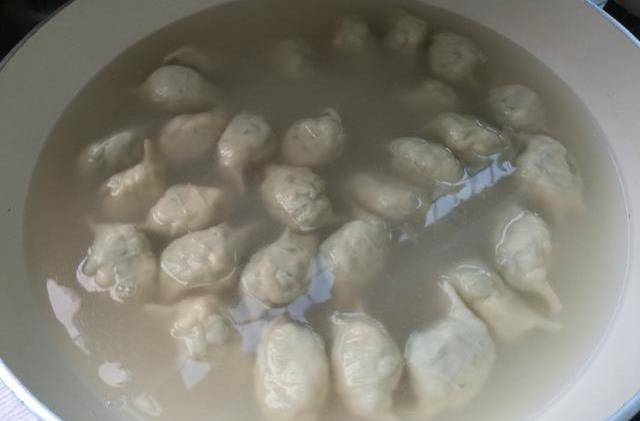 9、鍋內放入足量的水,煮餃子水要寬些,餃子才不容易破皮。水開後下入餃子,因為裡面的餡都是熟的,水開後再煮3分鐘左右餃子就好瞭。